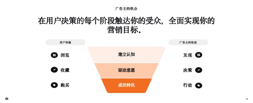 Pinterest天然覆盖用户从浏览 → 收藏 → 购买完整决策旅程,并为此设计了针对性的广告产品,让品牌可以在每个阶段与用户深度互动,全面实现营销目标。