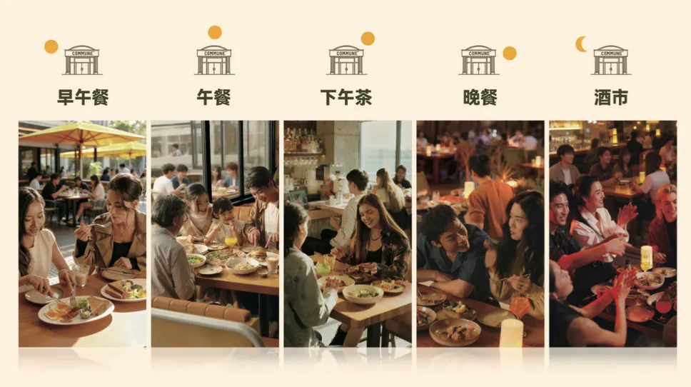 尤其是,不同于传统酒吧单一的夜间消费场景,COMMUNE从一开始就踩准了 “社交升级” 的需求。它将早午餐、下午茶、晚餐与夜间酒市串联成线,白天是家庭聚餐、商务简餐的优选地,入夜后则变身年轻人社交的潮流聚集地。
