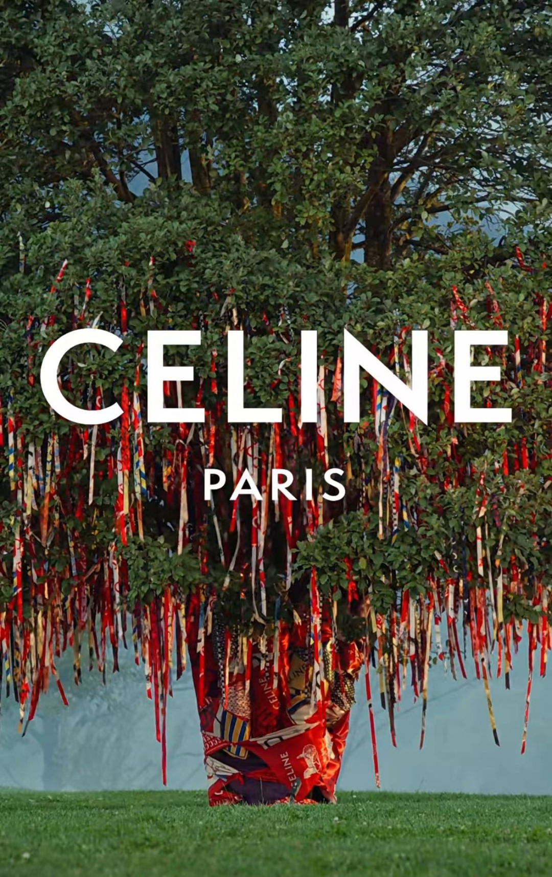 今年,CELINE选择了一条更安静的路线。为拍摄广告片,摄影团队前往云南实景打造了一棵“巨型祈愿树”,以当地常青树为原点,用数千条品牌标志性的丝巾与缎带进行装置化呈现。