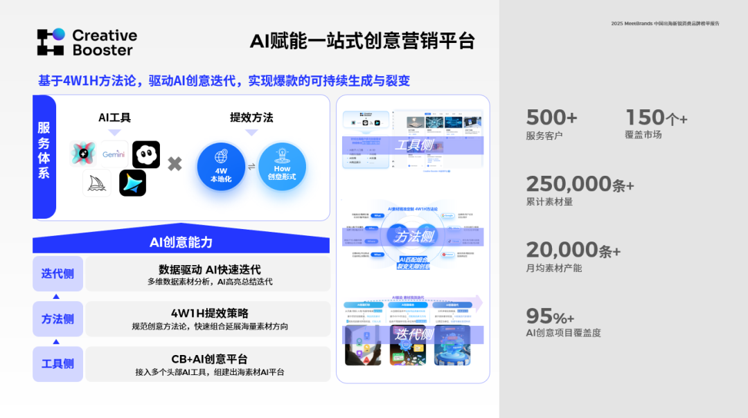 在创意节奏加快、素材生命周期缩短的趋势下,品牌需要的已不只是“做出几条好内容”,而是一套能够持续产出与快速迭代的创意供给体系。Creative Booster通过整合AI能力与数据分析机制,帮助品牌实现高频素材生成与多维延展,不再依赖单一爆款,而是围绕核心卖点不断拆解、重组与测试,形成稳定的创意矩阵。