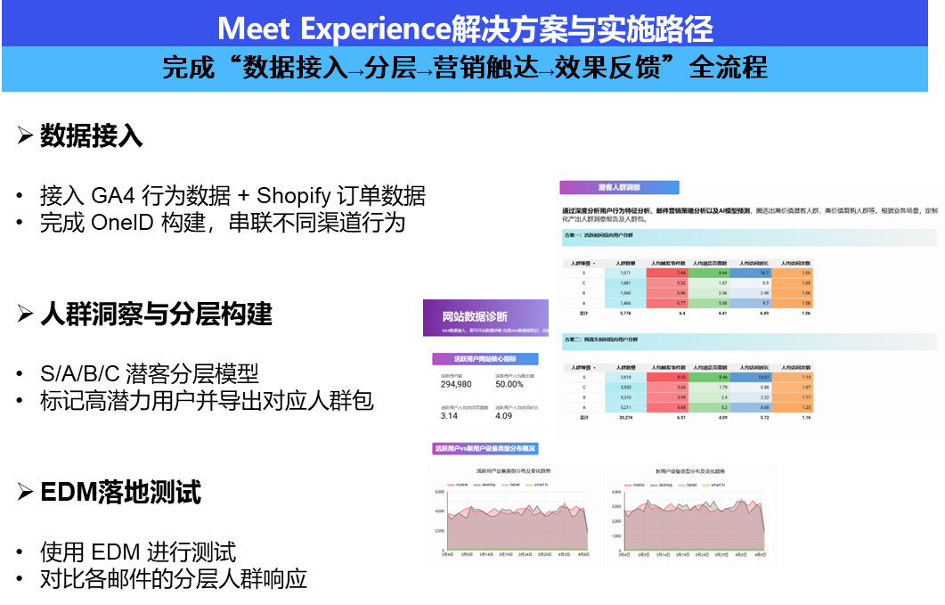 BeyondClick旗下Meet Experience首先打通GA4与Shopify数据,构建OneID统一用户视图。随后建立S/A/B/C分层模型,识别并标记高潜人群。通过EDM分层测试与效果追踪,实现精准触达与持续优化,帮助客户完成“数据整合—人群分层—精细运营”的增长闭环。