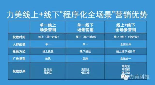 而相较于传统的单一线上或线下场景营销,力美线上+线下“程序化全场景”营销在投放时间、人群画像、投放方式、广告类型、投放效果上的优势更加突出: