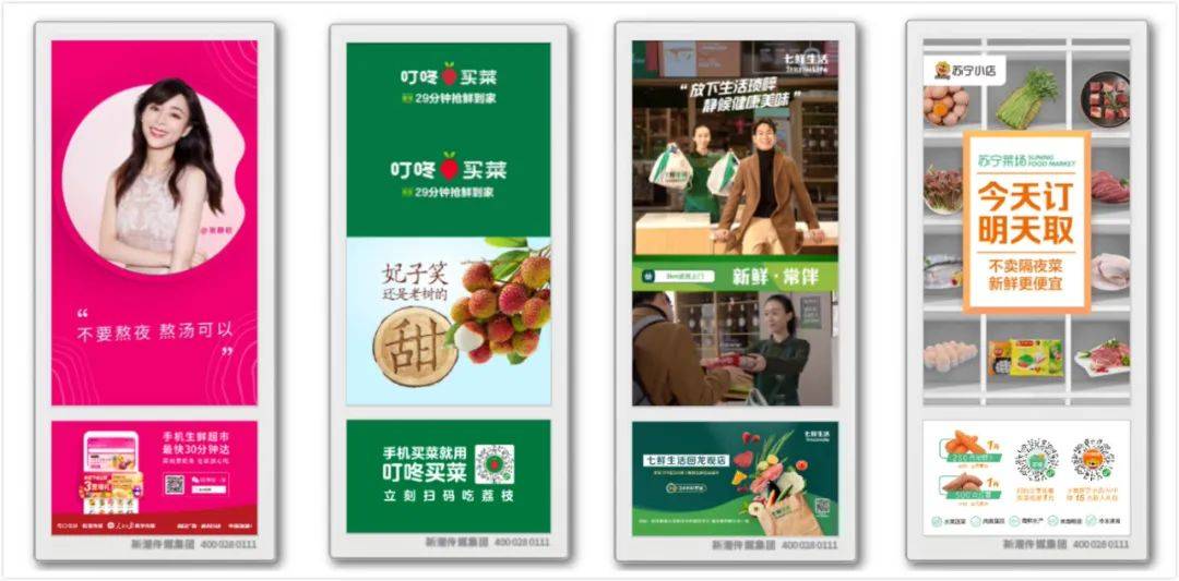 不管是从消费人群还是消费场景上,新潮电梯智慧屏都完美的契合了生鲜电商的需求。这也是每日优鲜、叮咚买菜、7鲜、苏宁小店等众多生鲜电商品牌集体抢登新潮电梯智慧屏的重要原因,借助新潮传媒覆盖全国103座城市的60万部电梯智慧屏,以离消费者更近、触达更精准、曝光更高频的方式,将“到家业务”送到最后十米的社区电梯里,快速占领消费终端。