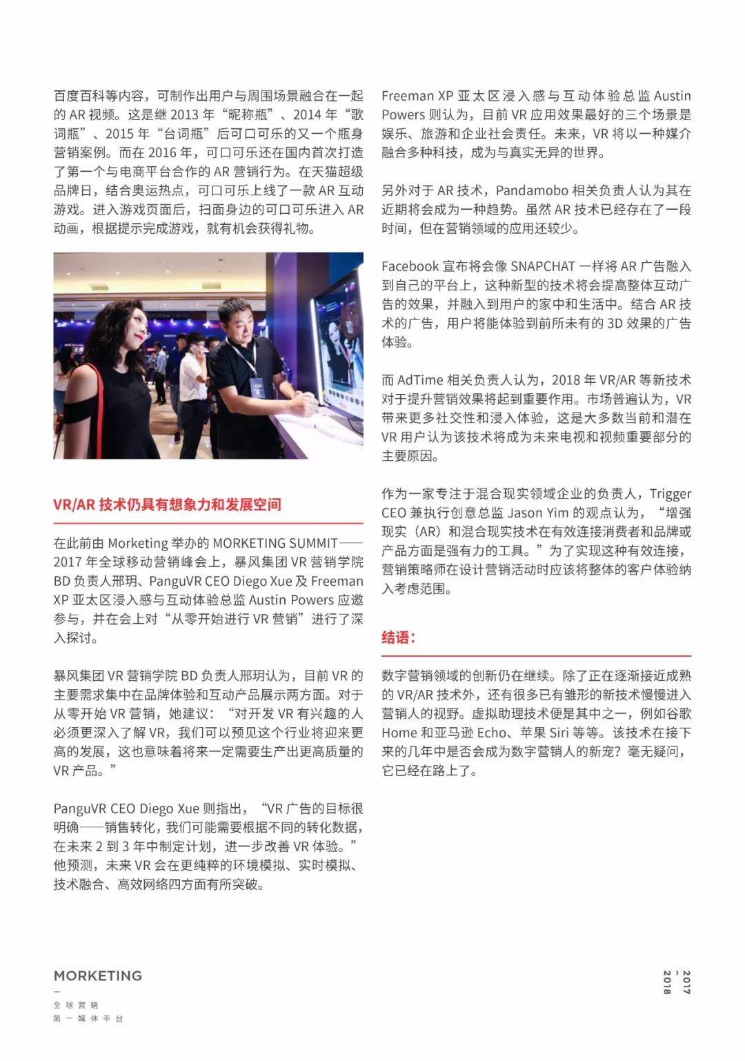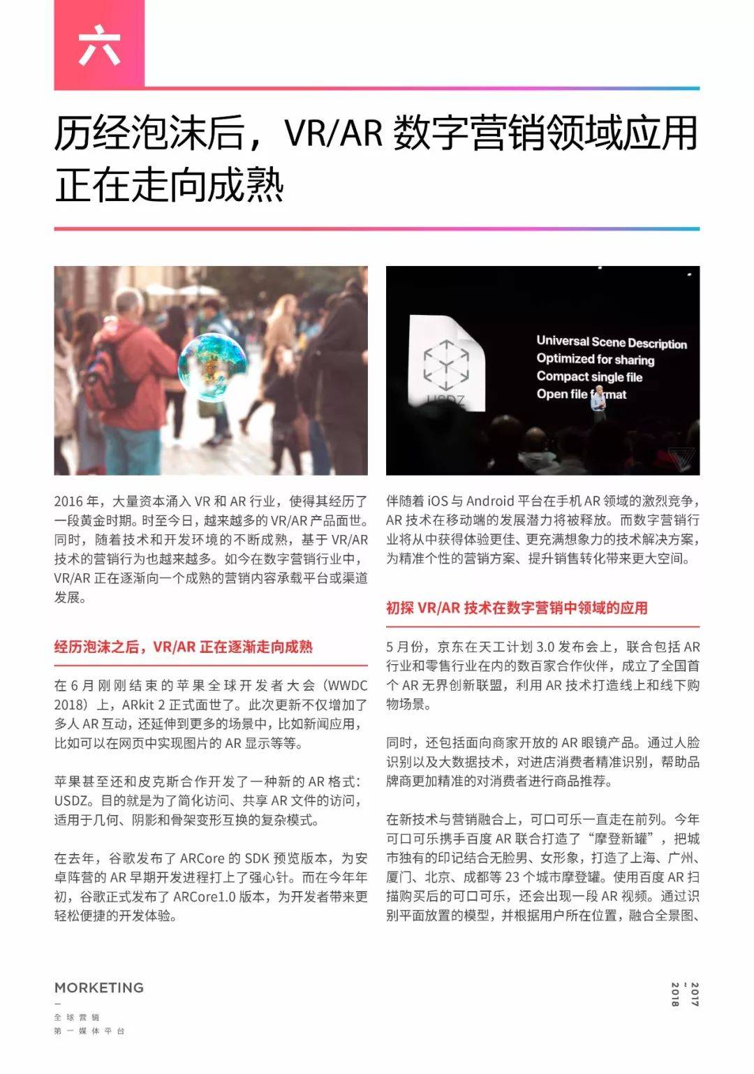 而AdTime相关负责人认为,2018年VR/AR等新技术对于提升营销效果将起到重要作用。市场普遍认为,VR带来更多社交性和浸入体验,这是大多数当前和潜在VR用户认为该技术将成为未来电视和视频重要部分的主要原因。