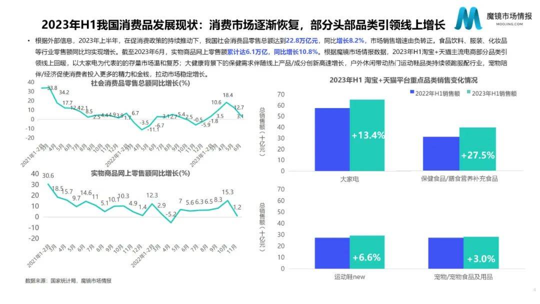 回顾2023年上半年,随着我国各地区各部门积极推动消费市场有序恢复,商品零售和餐饮等服务消费出现了明显的回升。虽然消费市场整体恢复向好,但是居民消费信心仍处于亟需提升的阶段,这也为当下国内消费行业带来了新的机会与思考。在社会经济逐步提升与消费信心仍需提升的当下,魔镜通过扫描市场各个赛道的新机会,从中依然发现了值得关注的增长点。
