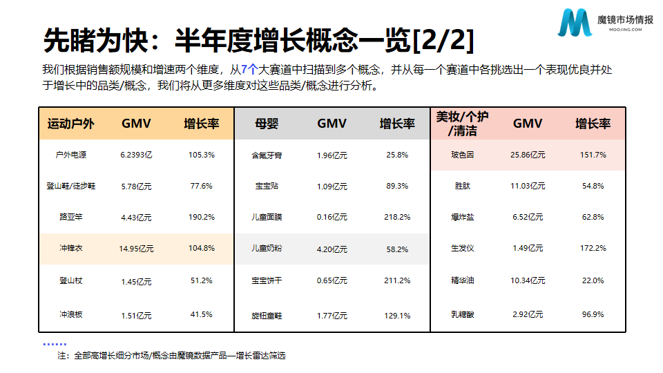 2023年上半年消费新潜力白皮书扫描了7大赛道,其中既包括家电、营养保健、食品饮料、母婴和美妆等传统赛道,也包括宠物、运动户外等新兴热门赛道。在以上赛道中,筛选了7个表现优良的高增长品类及概念进行详细剖析,如“槲皮素”、“儿童奶粉”、“玻色因”、“左旋肉碱咖啡粉”等,挖掘新时期消费者对于生活、消费的新需求。在此次白皮书中,魔镜增加了单品分析的维度,采用自研社交舆情洞察产品“魔镜社交聆听”,为读者带来人群洞察等新内容,同时也改进了内容框架。此次白皮书涵盖了淘宝天猫平台和抖音的销售数据,以及微博、抖音、小红书等社交平台推文和电商评论等舆情数据,通过多维度共同分析,增强了报告的全面性和可读性。现阶段消费者表现出了怎样的消费偏好?各大品牌应当抓住哪些潜力机会点和热门概念?消费发展的方向应该会在何方?接下来,让我们通过魔镜2023年上半年白皮书,一起寻找新的商业灵感吧。(关注iBrandi品创,后台回复“消费新潜力白皮书”,立即领取完整PDF报告)
