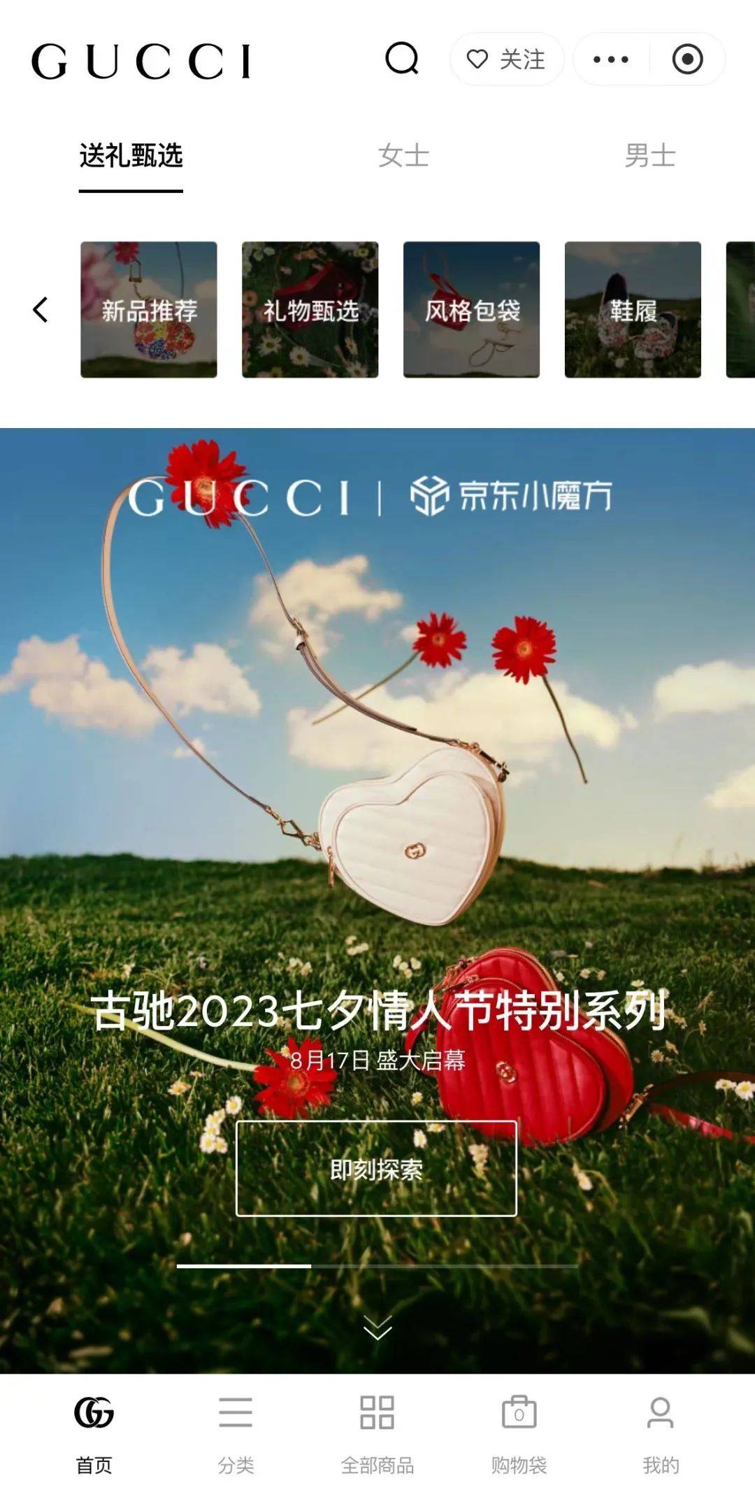 不同于BOTTEGA VENETA、QEELIN,作为开云集团旗下的最大的奢侈品品牌,GUCCI的入驻多了几分“贵族气质”。在京东搜索栏输入GUCCI后,并非是单纯出现官方旗舰店SEO,而是直接跳转到单独界面,同时官方店铺还结合了京东的AR、VR和3D等应用解决方案,在视觉和用户体验方面极具互动感。当然,除了GUCCI外,LOUIS VUITTON、TIFFANY、Dior等全球9成以上奢品大牌都已入驻京东,并实现同步上新。一众奢侈品品牌不断入驻京东,不仅仅是为了扩大品牌矩阵,同时也彰显了中国奢侈品消费市场的强大购买力。实际上,中国早已成为了全球最大奢侈品市场之一,而不断布局中国市场,也是一众奢侈品品牌渴望实现营收突破的新尝试。有数据显示,2020年全球奢侈品市场重挫31%,只实现了2634亿美元的消费额,彼时中国市场实现45%的高速增长,达到689亿美元,在全球市场占比由12%暴增到26%。而在去年,虽然中国奢侈品市场销售额同比2021年略微下滑4%,但在全球奢侈品市场占比仍然高达38%,依旧是全球奢侈品消费的重要力量。再以开云集团和奢侈品巨头LVMH为例来看,2023年上半年,LVMH营收达422亿欧元,同比增长15%,其中中国所在的亚太市场表现更为强劲,同比大涨34%。开云集团集团收入同比增长2%至101.35亿欧元,Gucci收入则下跌1%至51.28亿欧元,其中直营零售网络销售额同比增长1%,在七夕节点之际Gucci“牵手”京东,也几乎是在同时,旗下法国时装品牌Courrèges也宣布入驻天猫奢品,不难看出开云集团“意欲何为”。从消费市场来看,如今的消费者对于奢侈品的接受度和认知度越来越广泛,奢侈品品牌不断加入电商行业,参与大促节点营销,也就更能够引起消费者的关注。同时,中国消费者对高端品牌产品的需求日益增加,也将为奢侈品行业带来新商机。