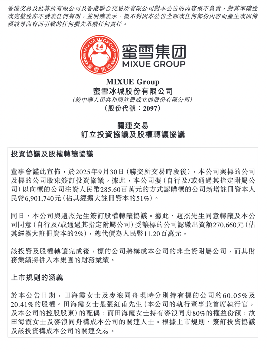 第一,蜜雪集团以人民币2.856亿元增资认购鲜啤福鹿家新增注册资本,占经扩大注册资本的51%。第二,从独立第三方股东处受让2%的股权,对价人民币0.112亿元。交易完成后,蜜雪集团持股比例达53%,鲜啤福鹿家将成为其非全资附属公司,其财务业绩将并入蜜雪集团报表。