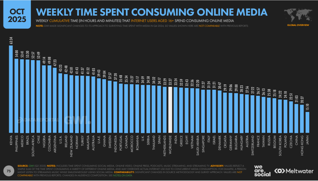 东非的肯尼亚以每周63小时24分(日均超9小时)的在线媒体消费时长位居全球第一;拉美的巴西、哥伦比亚等国,网民周均在线媒体时长均超45小时,日均超6.4小时,成为数字内容消费增长的关键引擎。