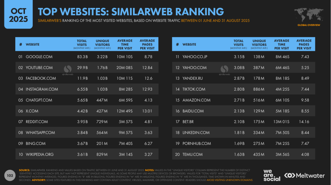 从流量看,SimilarWeb数据显示:YouTube.com(299亿)、Facebook.com(119亿)位列全球Top2/3网站,其中YouTube的用户平均停留时间达20分08秒,是品牌曝光的核心渠道;短视频平台增长迅猛:TikTok.com月均访问280亿,用户平均停留4分25秒。