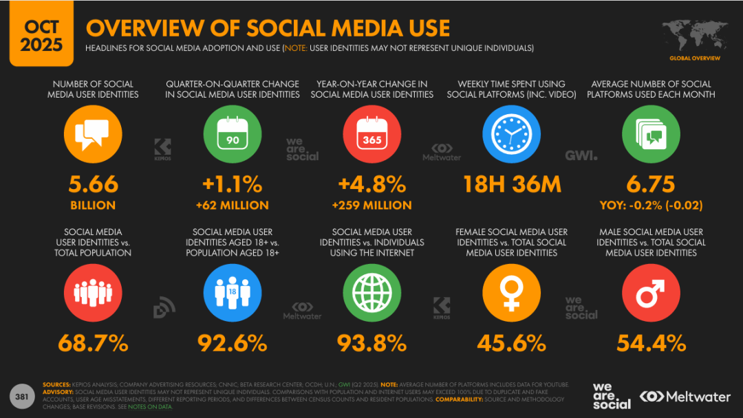 与此同时,社交媒体正在悄悄取代“搜索”成为消费者的起点。全球社交媒体用户身份(Social Media User Identities)达56.6亿,年化率增长4.8%,周使用社交媒体时长为18小时36分钟,每月使用的社交媒体平台数量增至6.75个。