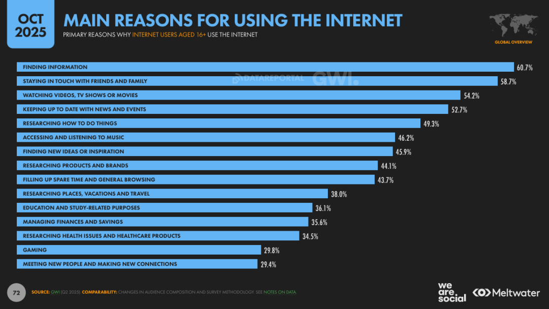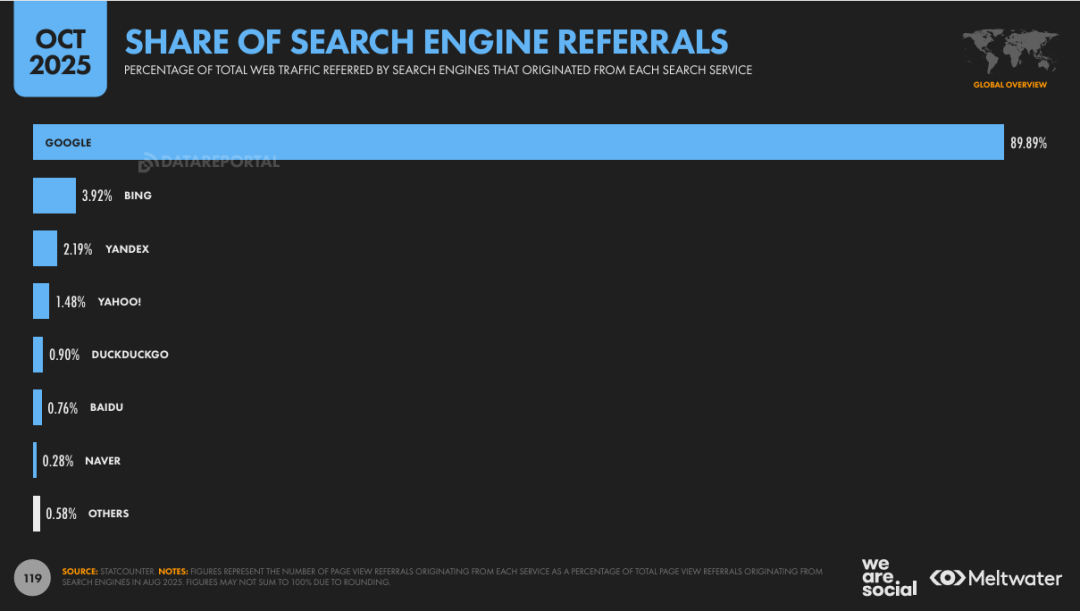 先看基础盘:报告指出,60.7%的用户将“查找信息”列为上网首要动机,其中一半多用于研究品牌或产品。全球搜索流量中,Google占89.89%, Bing(3.92%)、Yandex(2.19%)分列二三位,但值得注意的是俄罗斯(Yandex)、中国(百度)等特殊市场需调整。