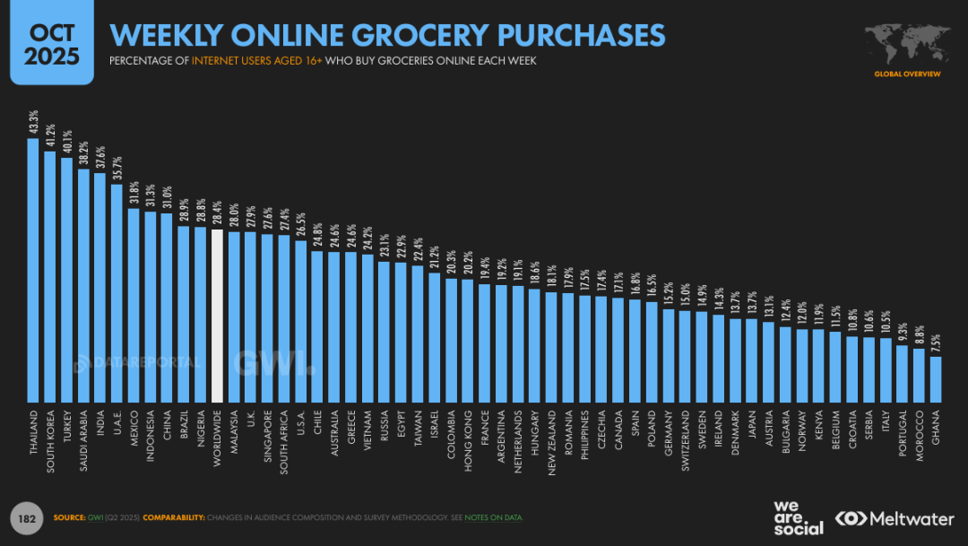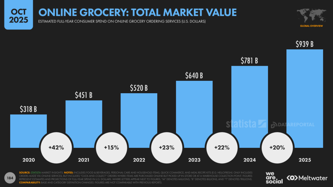 《Digital 2026》报告给出了一组颠覆认知的数据:2020年全球在线杂货市场规模为3180亿美元,2025年达到9390亿美元,5年间规模接近翻3倍,呈现出强劲的扩张态势。要知道,杂货原本是 “低毛利、低欲望” 的品类,这样的增长曲线堪称惊人。