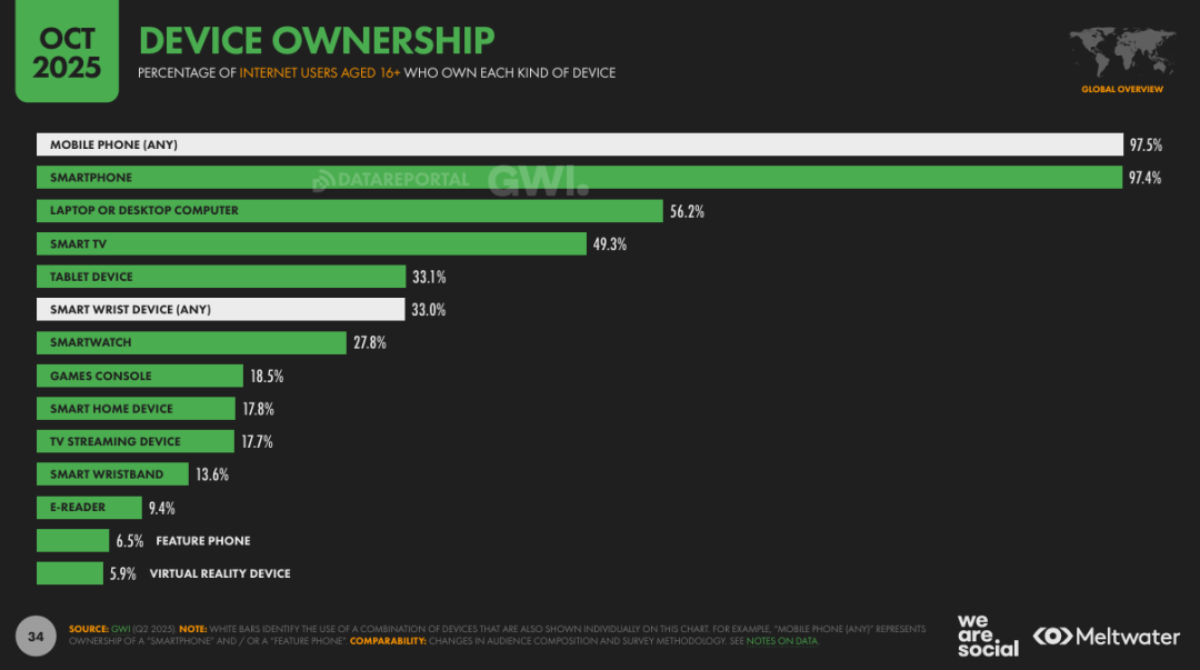 最明显的例子是可穿戴设备与智能家居系统的快速普及。根据《Digital 2026》报告,全球智能腕部设备拥有率达到33.0%,其中智能手表占据27.8%、智能手环占13.6%;智能家居设备拥有率达17.8%。