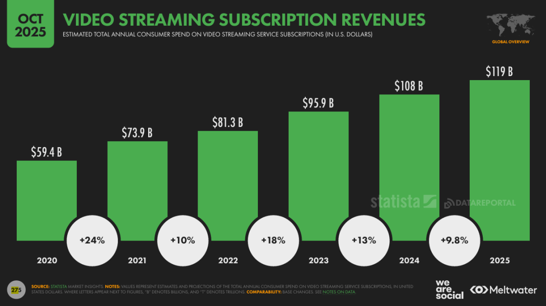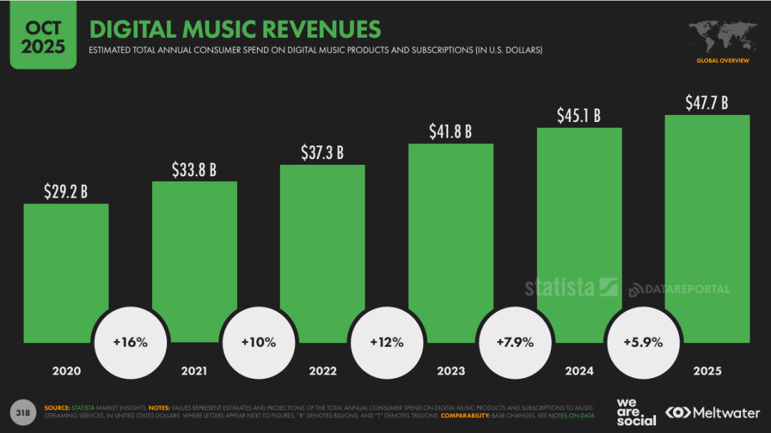 先看一组直观数据:视频流媒体订阅收入从594亿美元跃升至1190亿美元;数字音乐收入从292亿美元攀升至477亿美元;视频游戏市场规模从2020年的3440亿美元预计增至2025年的5220亿美元,三大领域的持续扩张,数字娱乐消费的旺盛需求。