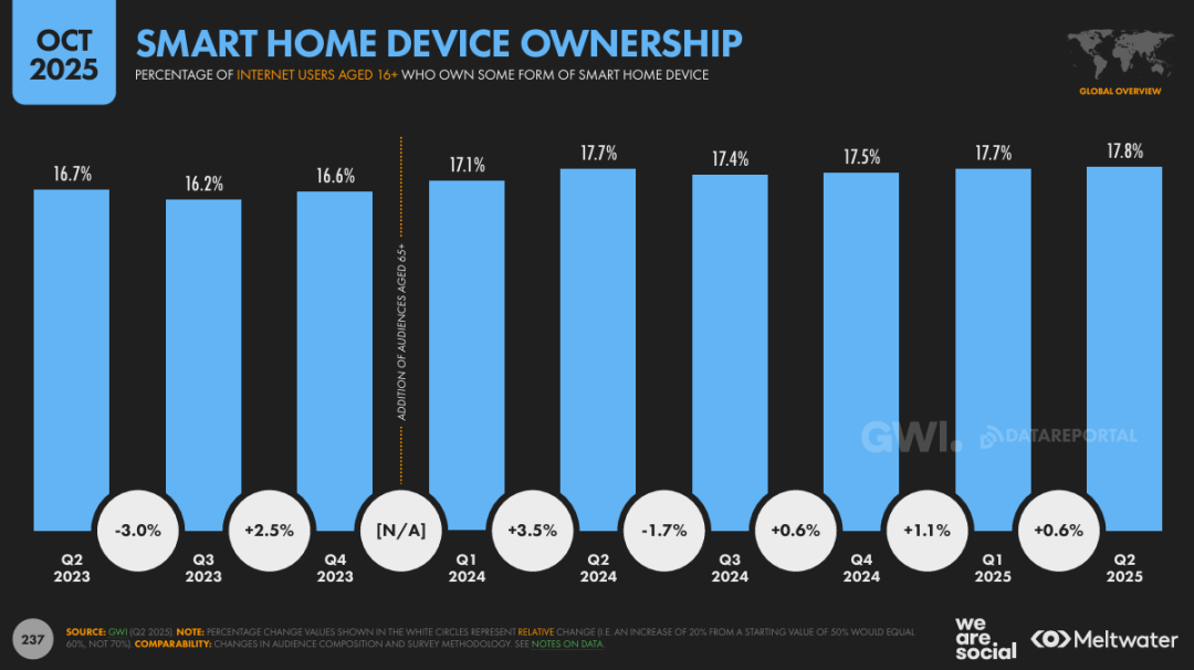 2023-2025年全球智能家居设备拥有率在波动中从16.7%升至17.8%,表明其在全球市场持续渗透、长期增长的强劲潜力。