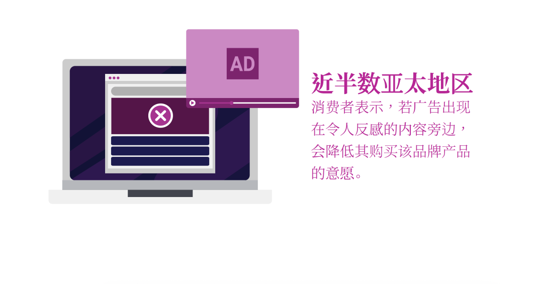 DoubleVerify CEO Mark:所谓拥有用户生成生态系统的“围墙花园”,不同平台之间体验差异很大,广告主难以统一管理跨平台投放。此外,围墙花园中的内容高速变化,可能同一频道里 90% 的内容适合品牌,10% 却不适合,如果人工去筛选显然不可行。研究显示(2),近半数亚太地区消费者表示,若广告出现在令人反感的内容旁边,会降低其购买该品牌产品的意愿。这种影响在有年幼子女的家长中尤其明显,其中有 52% 表示,内容不符的广告会对他们的购买决策产生负面影响。因此,“高质量曝光”与“高效率”之间的平衡,成为全球广告主普遍面临的困境。
