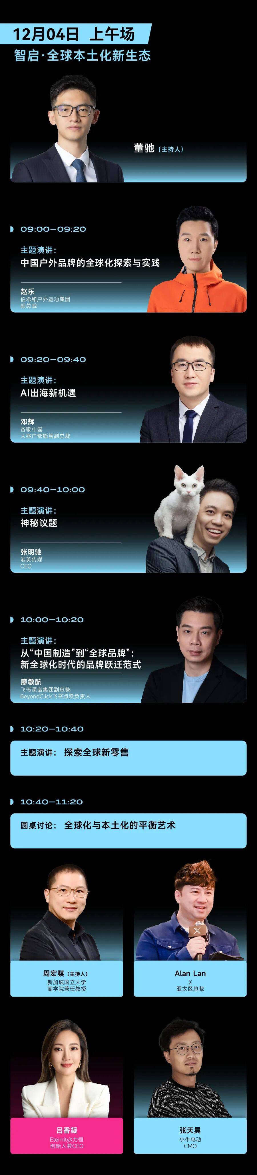 在「智启・全球本土化新生态」现场,X亚太区总裁Alan Lan、小牛电动CMO张天昊、EternityX力恒创始人兼CEO吕香凝,将与主持人新加坡国立大学商学院兼任教授周宏骐,以《全球化与本土化的平衡艺术》为主题展开圆桌探讨。