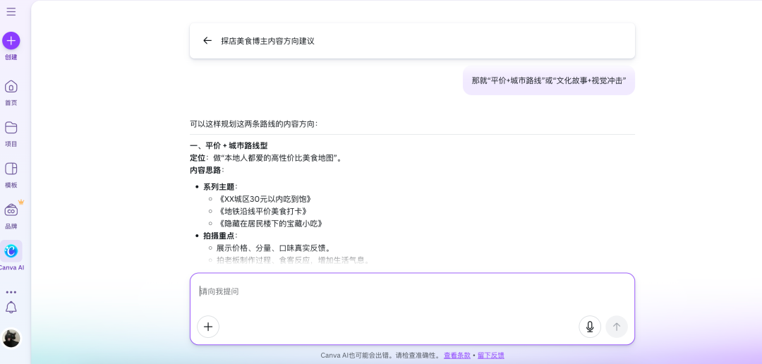 于是,与许多强调“生成能力”的 AI 产品不同,Canva AI的切入点非常明确:先解决“怎么开始表达”的问题。