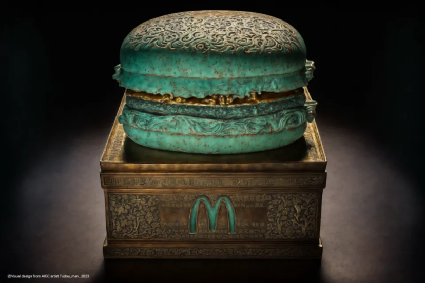 【麦当劳中国“麦麦博物馆”系列】就是一个有趣的前兆案例:一位AIGC艺术家受麦当劳粉丝文化启发,用Midjourney和PS批量生成了青铜器汉堡、宝玉薯条、青花瓷可乐等创意图,首发在小红书迅速爆红90万浏览,后来麦当劳干脆官方合作发布全套作品,引发全网刷屏。