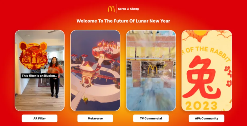 第一阶段:AI工具化(现在进行时)。这一阶段大家很熟悉了——用AI写文案、做海报、剪视频、生成图片等等。AI充当的是“助理”角色,解决效率和成本问题。比如麦当劳用AI和网红合作做了一支创意AR滤镜的新春广告,把创作者童年记忆用NeRF三维重现,让用户扫码手机就能沉浸体验这些都是AI提高创意表现力和产出的案例。但坦率说,阶段一的AI并没有动营销的根本架构——我们仍然是在传统流程中用AI加点速。