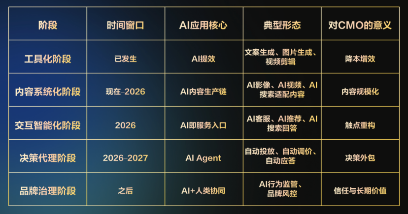 (AI演进路径:从工具到内容系统到服务入口到决策代理到品牌治理。)