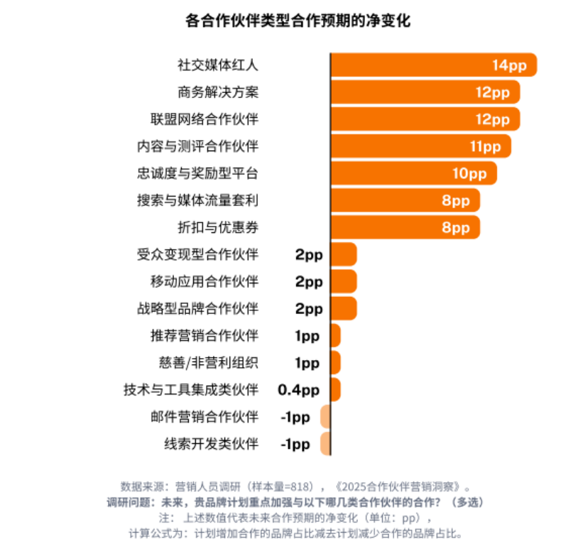 社交媒体红人是最明确的增量方向,净增14个百分点;商务解决方案与联盟网络伙伴净增12个百分点;内容与测评伙伴净增11个百分点。这些变化反映出品牌在加大对“信任型触点”的投入。