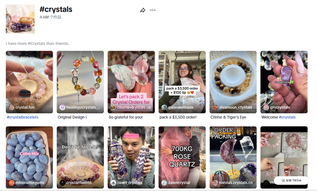 如果说中医对应的是身体,那玄学水晶切中的,就是情绪。抖音上的玄学水晶往往是越东方,越好卖。在 TikTok 上,#Crystals 这个话题的体量已经到了460万条视频的规模。卖水晶的直播间,经常能跑出上万的实时观看。