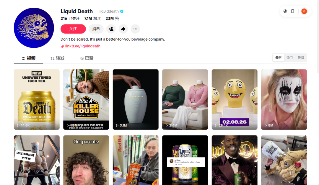 这话不是说说而已。Liquid Death的社交媒体运营堪称“内容生产机器”。截至2026年,它在TikTok上的粉丝数已高达710万,在Instagram和TikTok的总粉丝数超过1400万。