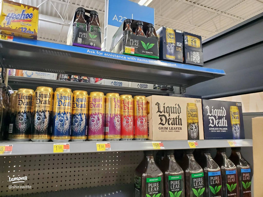 2020年,Liquid Death进驻Whole Foods。这一年,光是Whole Foods这一家渠道的年销售额就超过了1000万美元。随后,它迅速铺进7-Eleven、Kroger、Target,还成为了亚马逊上最畅销的饮用水品牌。截至2024年,Liquid Death已在美国和英国的11.3万家零售门店上架,包括Walmart、Target、Whole Foods、7-Eleven、Publix、Albertson’s等几乎所有主流零售连锁。