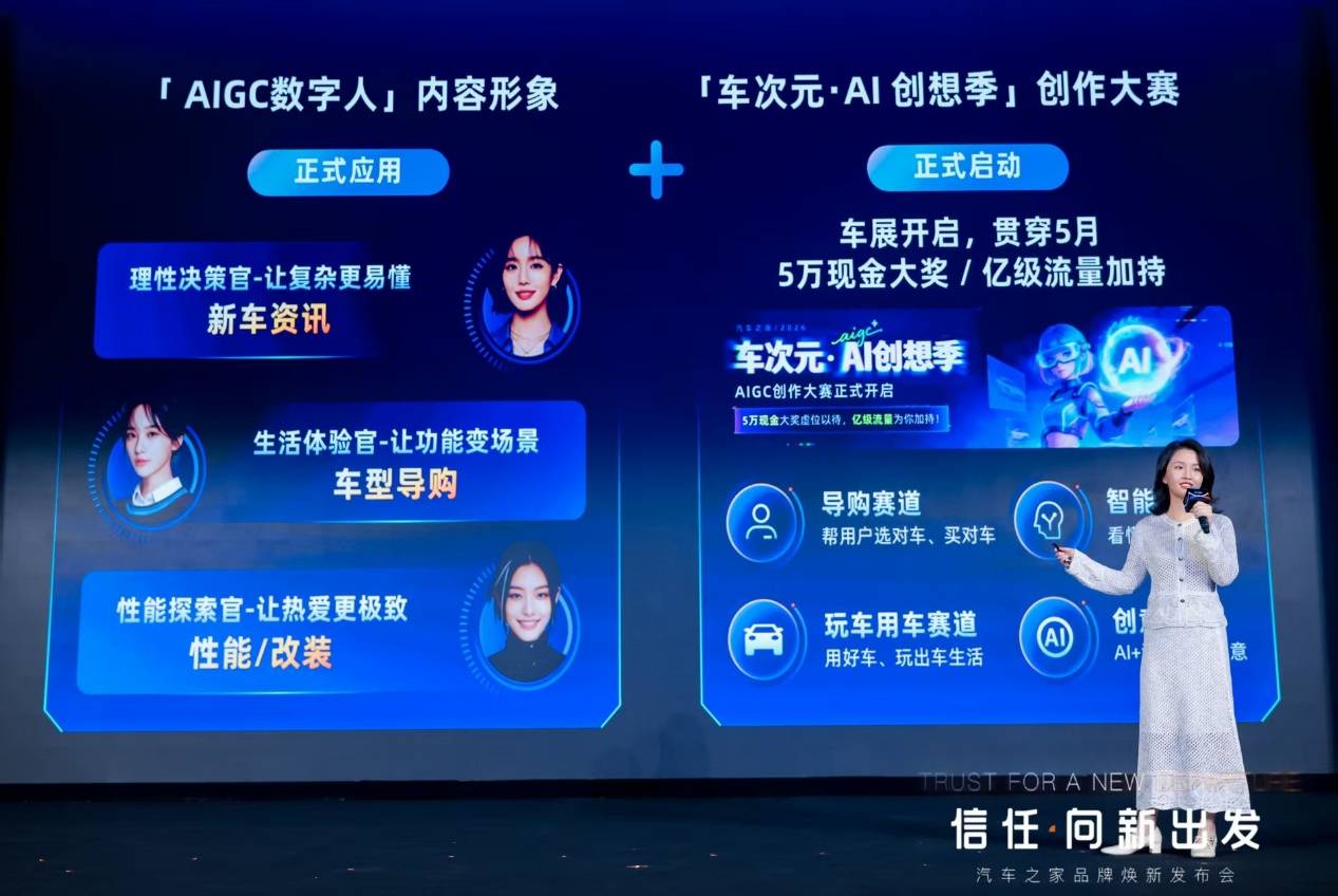 据悉,本次发布的 AI 技术矩阵,深度融合汽车之家自研仓颉大模型等核心能力,构建覆盖全场景的智能服务体系。全新数字人作为汽车消费领域创新交互载体,突破传统图文、语音交互局限,可直观了解车辆真实细节、提供个性化选车建议,让用户足不出户即可享受“一对一”专业服务;通过现场展示,AI 智能助手实现全场景智能覆盖,精准捕捉用户需求,提供匹配度超 90% 的个性化推荐与专业参考,借助科技与智能的力量,真正实现决策安心、买车省心、信任托付,让汽车消费回归简单。AIGC创意大赛同步启动,以汽车为创作主线,诚邀全网创作者,共同推动汽车内容生态向科技化、多元化、高品质升级。
