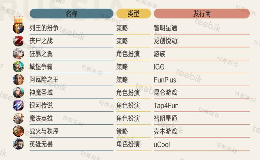 俄罗斯Google Play畅销榜排名TOP20中,中国公司开发的游戏数量约有10款,月均总收入可达400多万美元,约是美国游戏收入的2倍之多,随着早年智明星通《列王的纷争》为中国游戏在俄罗斯市场开辟道路并登堂入室,近年无数优秀的中国游戏都纷纷进驻俄罗斯市场,并圈地成功,智明星通、IGG、龙创悦动、Tap4Fun的游戏在俄罗斯都有很好的渗透。