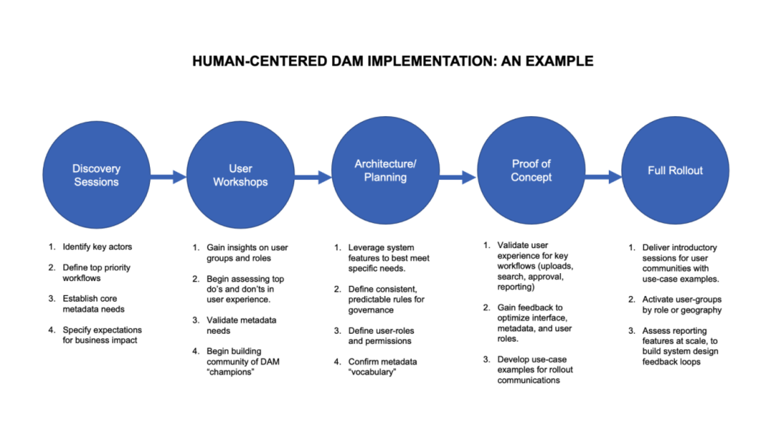 尽管以人为本方法不能保证DAM的成功,但是研究表明,这是提高DAM使用时长和用户满意度的最佳途径。这意味着DAM供应商需要提高其系统内提高灵活性,以便DAM管理人员在牢记以人为本理念的基础上,设计出特定的信息构架和工作流。