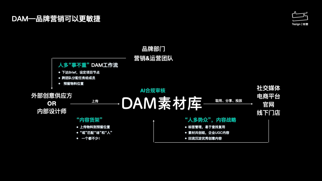 抢先使用DAM的大公司,已经和新的数字时代保持同频,站稳了自己的市场位置,也稳住了自己的品牌自信。大公司的体量,要想一夜之间掉转方向确实不是一件易事,但“大公司”可以借像特赞这样的“快公司”之力,加载“敏捷高效”的技能,将高效内化为自己的优势。