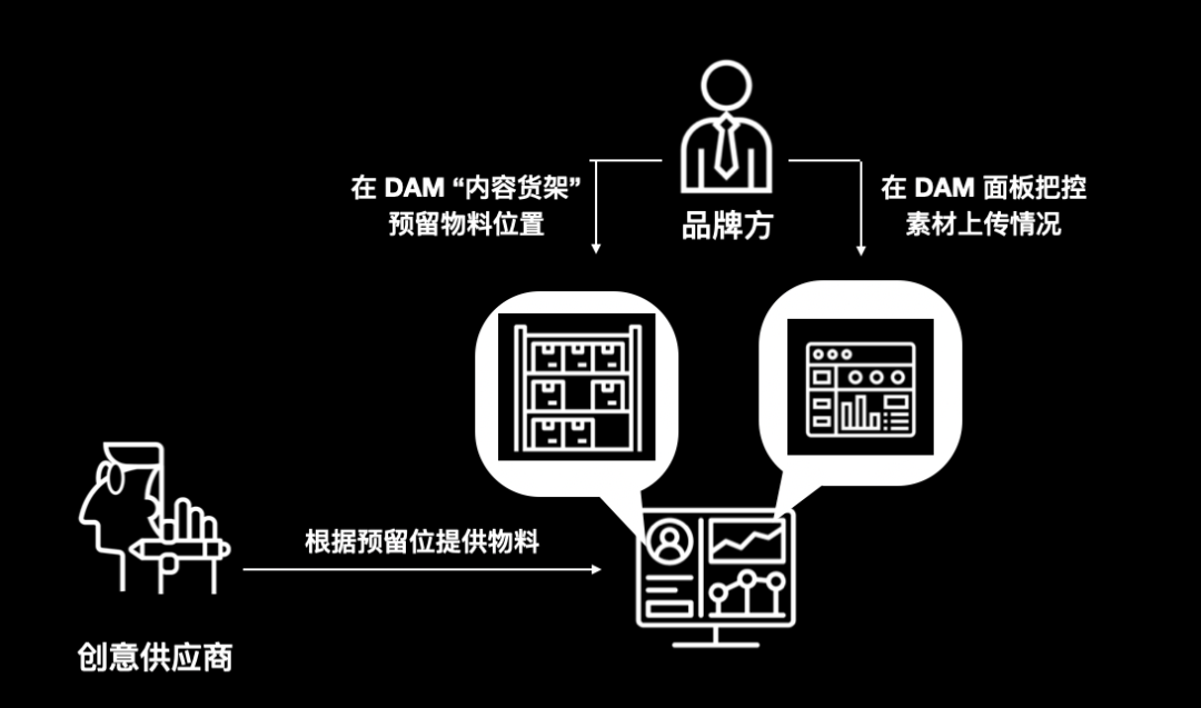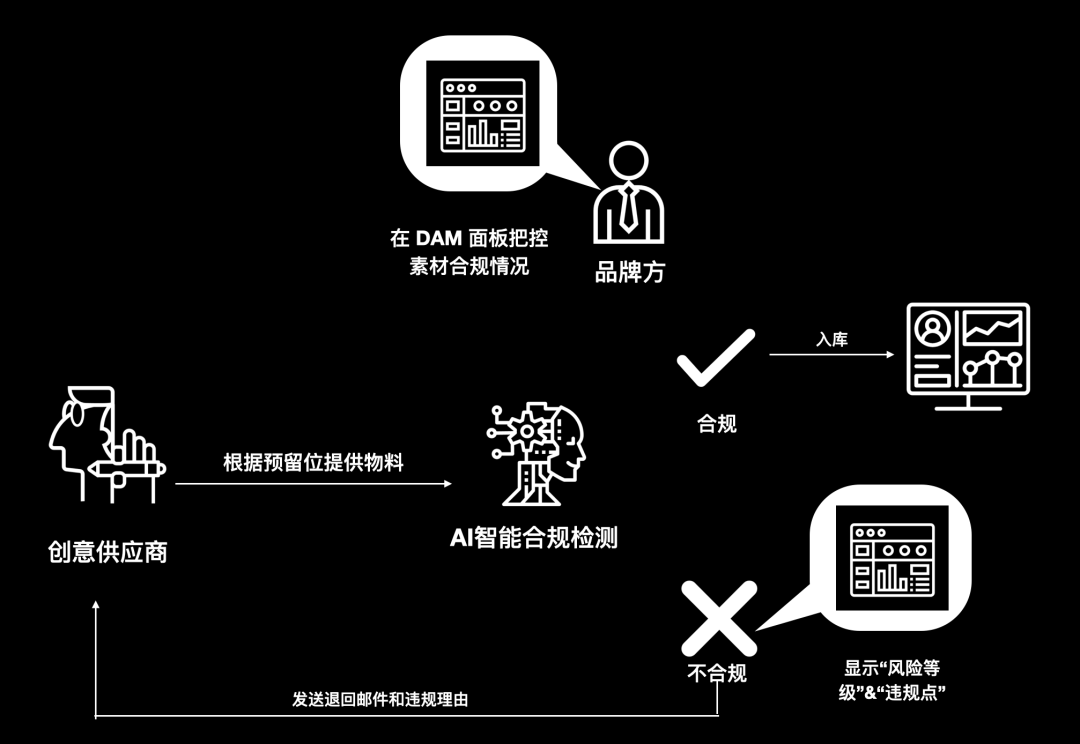在大企业,“人多势众”有时候也会变得“人多事重”,复杂的结构关系容易导致团队伙伴之间出现信息传达错误、信息缺失、目标不统一、信息不对称等各种沟通隐患。物料多、渠道多、用途多还会造成一个问题:如果内容被塞到了错误的文件组、传给了错误的团队怎么办?如果漏传了文件怎么办?或者说有时候即便漏了文件团队也没检查出来……人工处理难免出错,如何才能让所有内容素材乖乖“站到”正确的位置?DAM 用“内容货架”把产品的内容全部根据品牌的产品类别、投放渠道、点位、内容类型,提前预留好“内容坑位”。3.应用AI技术机器审核出街物料,维持品牌统一调性面对各个投放平台、社交渠道“独领风骚”的投放要求,品牌方挨个检查图文、视频物料十分头痛;每逢双十一等重大营销节点,物料规范还会有所变动。大品牌可以引入更高端出色的内容管理系统来进行人工智能合规检测。经过合规检测的物料才可以正式上传进入DAM供公司相关部门使用,对于未通过审核的内容素材,品牌可以查看具体违规原因、并且相应退回给创意方进行调整。人工审核大量品牌图文、视频物料,耗时且容易出错?