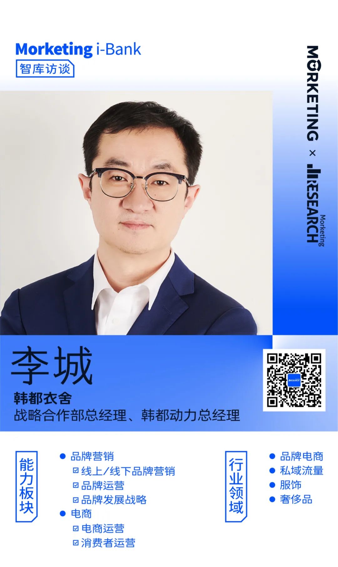 韩都衣舍电子商务集团股份有限公司战略合作部总经理、山东韩都动力电子商务有限公司总经理李城,拥有十年线下品牌和十年电商运营实战经验,并曾担任全球奢侈品服务平台寺库网创始合伙人。