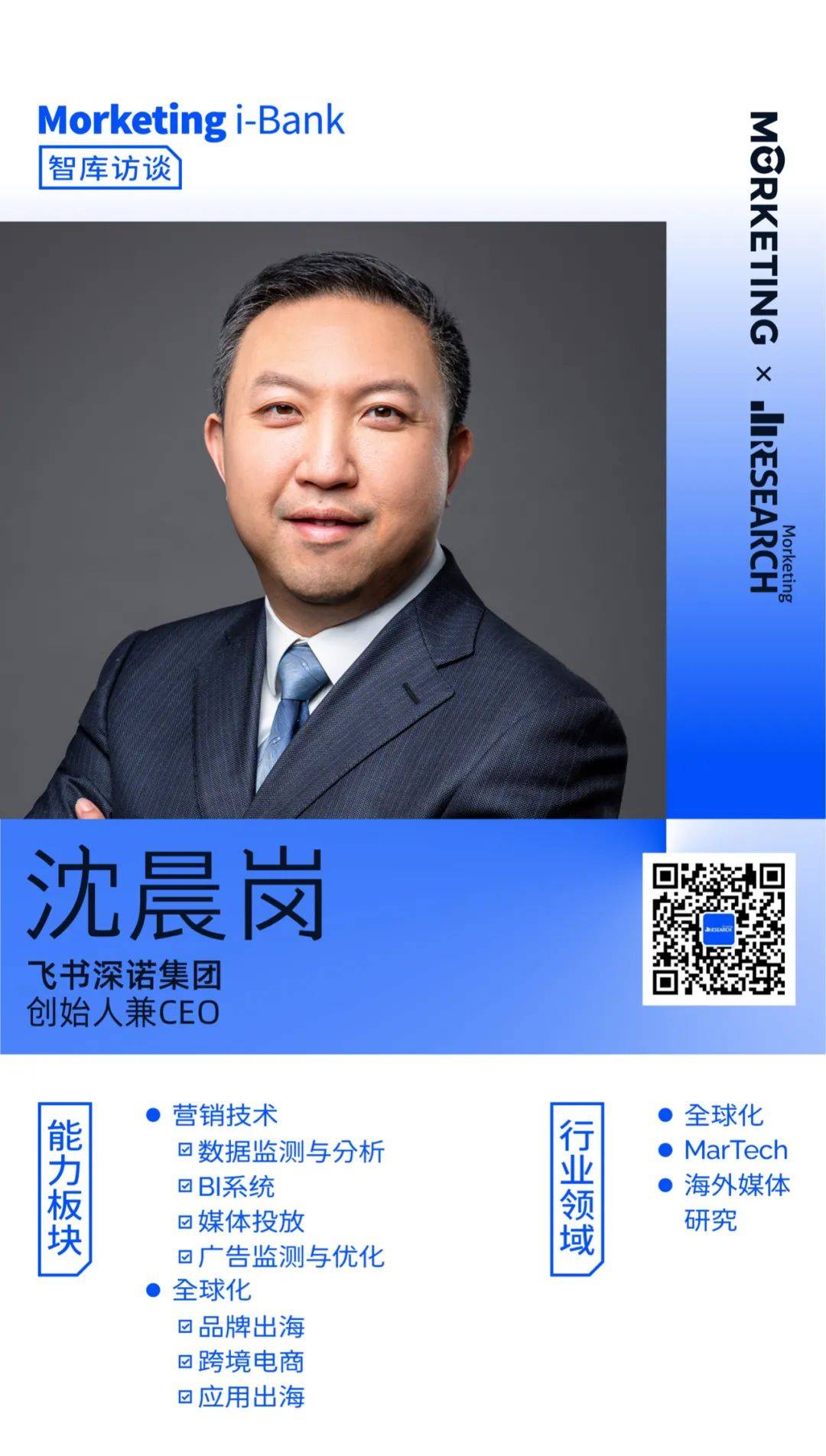 2014年,沈晨岗创立飞书深诺集团,带领其发展成行业顶尖的海外数字营销综合服务集团,并帮助数万家中国企业打破全球营销边界,实现海外业务飞跃式拓展。在公司成立初期,他和团队就优先拿下多家国际头部媒体的中国广告代理资质,并通过果断推动技术、数据、创意服务的升级,实现了公司的高速发展。作为出海数字营销领域的代表,他入选了《快公司Fast Company》中国商业最具创意人物100。