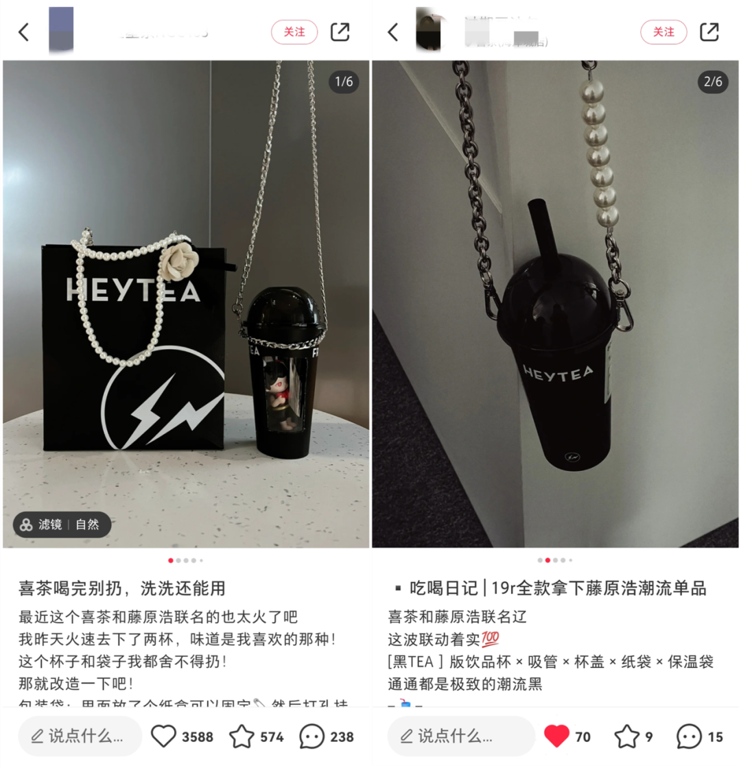 而在小红书等平台上,喜茶和藤原浩的联名产品更是引发了一轮灵感创作风潮。许多网民充分发挥了灵感创意,对喜茶和藤原浩联名的饮品杯子、纸袋、保温袋进行全方面的二次创作。比如饮品杯子被改装成了花瓶、笔筒,保温袋被改成了背包、纸巾盒等等。每个消费者根据自己的灵感创意,给这些联名产品注入新的灵感,让此次联名活动变得更酷。