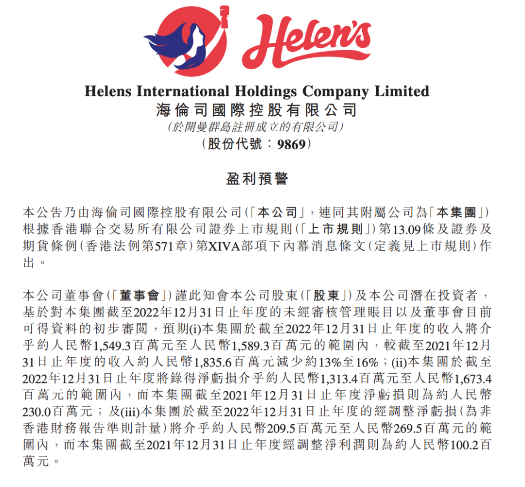 「海伦司」发布盈利预警:2022年预计亏损13-16亿元