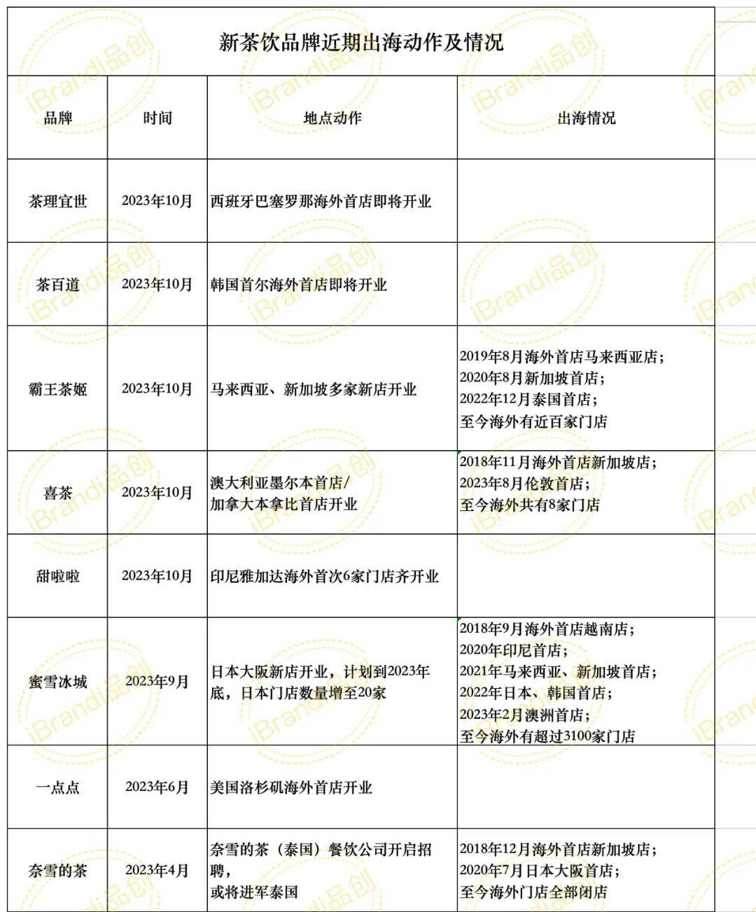 新茶饮出海不是什么新鲜事,但值得注意的是,近几个月,新茶饮们的出海进程,都在默契提速。10月25日,据日本经济新闻报道,蜜雪冰城将扩大在日本的门店数量,并计划在2028年前后将日本门店增加到1000家;“雪王”的老对手甜啦啦10月1日在印尼开了首批6家新店;头部品牌喜茶也接连在伦敦、墨尔本、本拿比等地正式营业;奈雪的茶、霸王茶姬、一点点等品牌更是早就进入海外市场,就连刚走出广州的新品牌“茶理宜世”,也要去西班牙开启首店了……如果说前两年,新茶饮品牌出海我们还可以用“试水”、“不失一次探索”来形容,那么自今年以来,新茶饮品牌默契地选择走出国门,甚至加速出海,则多了几分想要“不掉队”的心态。 国内新茶饮内卷是事实,走出国门后,到底是为品牌故事“添彩”还是“增压“?从年初开始,新茶饮品牌就在出海上动作频繁,“秋天的第一杯奶茶”季来临后,各品牌又纷纷默契提速。从上图中可以看出,9、10月成为品牌出海密集期。其中,有些品牌今年第一次出海,有些品牌早已是海外老手。从2018年起,奈雪的茶、喜茶、蜜雪冰城这三家企业就已经进军东南亚市场,随后霸王茶姬也在马来西亚开始出海首站。直到今年,各新老品牌加速出海进程,迎来了一波“爆发式”出海。只不过,虽然都是出海,但在具体的出海招数上,却各有不同。本文试从产品、价格、渠道、营销四方面,对喜茶、霸王茶姬、蜜雪冰城以及奈雪的茶这4家出海多年的新茶饮品牌进行打法复盘。产品上,喜茶延续国内的高品质鲜果茶风格并以当地网红元素创新产品。首站进入新加坡后,喜茶除了保留经典饮品,还根据当地人对榴莲、网红零食“咸蛋黄味炸鱼皮”的热爱,推出新加坡特有产品榴莲冰淇淋与咸蛋黄冰淇淋等。以此打造出当地人喜爱的“网红”爆品。价格上,喜茶的海外定价高于国内。以多肉葡萄冻标准杯为例,国内售价18元,而新加坡、伦敦、墨尔本店价格分别约为31元、57元、45元人民币。显然,喜茶的定价与其处在核心商圈的门店相匹配,目标群体多为白领等主流消费群体。渠道上,喜茶前期门店皆为直营,今年3月时才启用合伙人模式开发海外市场。在海外,直营的成本压力过大,且面临对当地市场不了解的风险。而合伙人模式可以通过合伙人获取资金与当地资源的支持,分散企业自身风险。这也印证喜茶准备加速铺开海外门店的计划。营销上,喜茶通过“城市特色”作为品牌传播点,围绕门店城市的特色景点做出城市限定冰箱贴、设立旅游打卡点等,吸引当地人与游客消费并在社交平台上分享。产品上,霸王茶姬海外产品几乎和国内一样,以“原叶茶+鲜奶”的品类差异化打入市场并保留清淡口味,不时配合营销活动推出当地限定产品,像限定饮品玫珑蜜瓜等。与国内相同的产品体系更容易使其把控整体供应链,达到统一标准化生产。价格上,霸王别姬维持与国内类似的中低价定位,可见目标消费者也与国内类似。以伯牙绝弦中杯为例,国内门店售价为16元,马来西亚、泰国价格分别约为18元、19元人民币。渠道上,加盟模式成为霸王别姬拓店的主要方式。相比直营与合伙人模式,加盟模式门槛更低,可以更快地铺开店面,抢占市场。霸王别姬在四年内开业近百家门店,加盟模式起到重要作用。营销上,霸王别姬运用“国风+本土潮流”的方式,设立国风+当地特色门店、请当地名人作代言人、大搞潮流联名活动等。其在马来西亚请李宗伟当代言人,在新加坡联名星穹铁道送周边活动,都是为了从潮流上接近当地年轻消费者,增加社交平台打卡次数,打开品牌在当地的知名度。产品上,蜜雪冰城在保持国内饮品的基础上,基于当地年轻人喜好不断推出新口味,像新加坡的草莓甘露、越南的覆盆子奶盖等,都是国内没有的新品。与其他三家品牌最大区别是,蜜雪冰城根据当地人的口味习惯,提升了整体饮品甜度。价格上,蜜雪冰城依然主打低价策略。虽然其在海外市场的价格略高于国内,但以当地本土市场来说,雪王还是最具性价比的品牌。以其镇店之宝冰淇淋和冰鲜柠檬水为例,国内价格为2/4元,越南、印尼、新加坡、日本、悉尼价格分别约为3/6元、3.7/4.6元、5.4/13.4元、7.8/12.6元、9.4/17元人民币。渠道上,蜜雪冰城和霸王茶姬一样,选用加盟模式开店。这种方式带来飞快的扩张速度,至今其在全球已经拥有超过3100家门店。营销上,蜜雪冰城运用自身火爆IP,结合当地文化,打造出既统一又有本土化特色的品牌形象。基于国内版本,雪王形象根据本土特色进行调整,主题曲也改成当地语言版本。并且,和国内“街溜子”雪王一样,海外各大街道也都是他的身影,唱歌跳舞、巡回散步,以此吸引民众目光,拉近消费者与品牌的距离,为品牌引流。产品上,奈雪的茶经营版块与国内类似,同样由茶饮、烘焙和零售三部分构成。与以上品牌不同的是,奈雪的茶更注重烘焙产品的地域特色。日本首店中,其推出结合京都宇治抹茶与日本当地卡仕达特点的抹茶卡仕达,以及以大阪特色食品“章鱼烧”为灵感的章鱼烧面包等。价格上,奈雪的茶定价以高端为主,主要针对高消费群体。以招牌产品霸气芝士草莓中杯为例,国内价格21元,店铺营业时日本价格约为44元、新加坡约为43元人民币。渠道上,奈雪的茶在当时选择和国内一样的直营模式。其创始人认为,直营模式可以更好的把控店铺经营和产品质