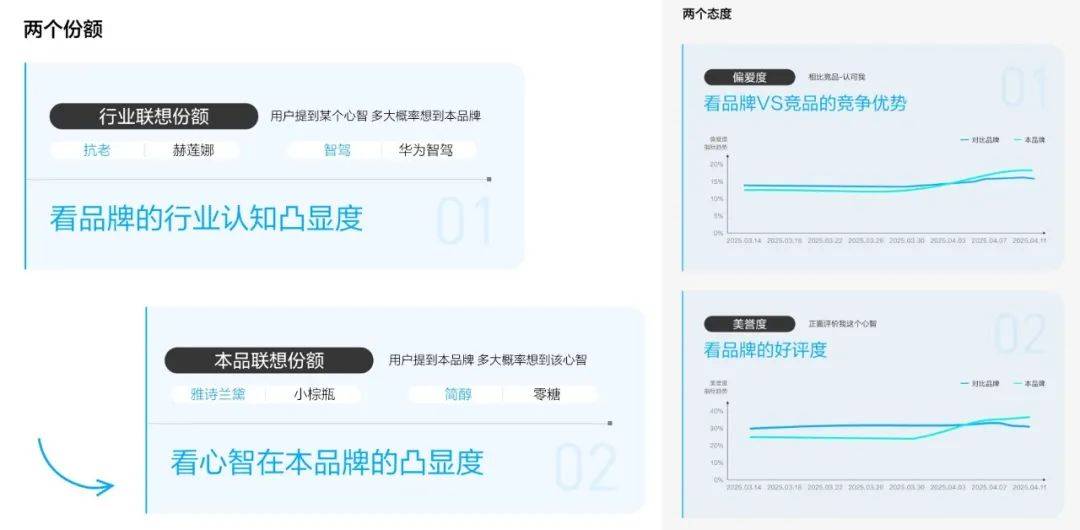 两个态度,则是让品牌摸清楚用户心思的:“偏爱度”最见真章,当品牌跟竞品放在一起,用户更偏向品牌的概率多少,这就是实打实的心智竞争力。“美誉度”是看用户对品牌的正面评价占几成,直接体现品牌口碑质量。
