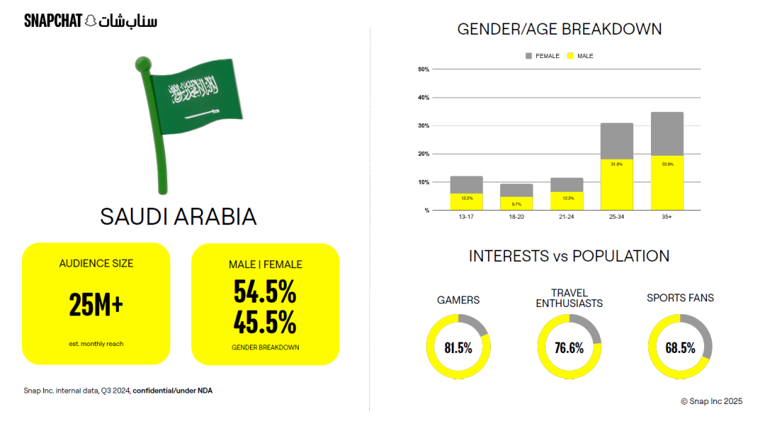 Snapchat 无疑是当地年轻人的社交主场之一。在沙特,它的每日活跃用户超过 2500 万。更重要的是,这些平均每天打开应用超 50 次的用户从早到晚都在活跃,注意力高度集中在熟人分享的内容上。