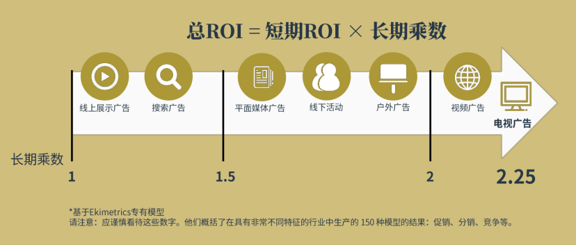 《白皮书》提出,“营销活动长期ROI与短期ROI存在比例关系”。举个例子,假设上图某品牌策划营销活动,4个月内电视广告只能带来有限的购买量,但若将目光放到未来两年里,那么电视广告的实际ROI将高至2.25倍,即使不被算在当年的营销收益中,但仍为品牌带来强劲的长期增长。