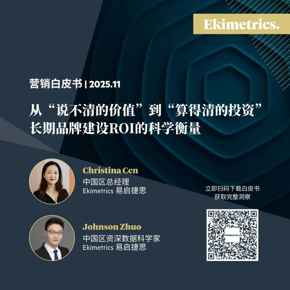 Morketing关注到,Ekimetrics发布报告《从“说不清的价值”到“算得清的投资”:长期品牌建设 ROI 的科学衡量》(下称《白皮书》),提出了长期乘数模型、未观测成分模型、嵌套模型、CLV-MMM模型,旨在以4种模型打破行业困局,为企业提供真正能落地的品牌价值衡量方法论。