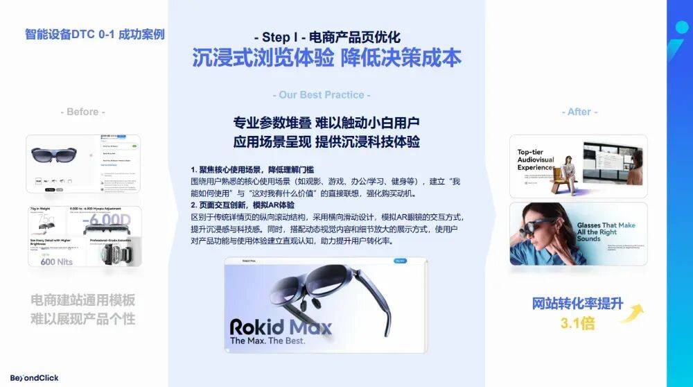 通过独立站体验重构 × 深度本地化内容表达 × AI驱动创意提效,BeyondClick协助Rokid将技术优势转化为海外用户可感知、可理解、可转化的价值表达。