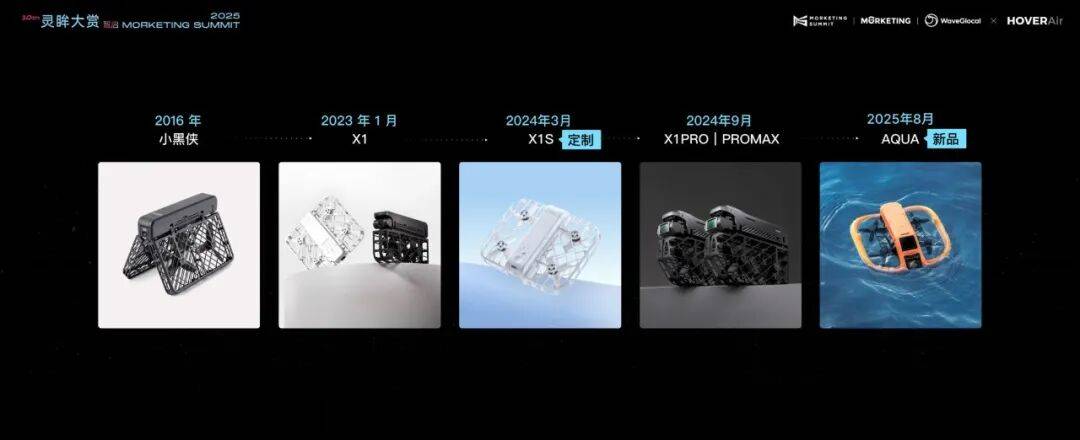 零零科技是我们的公司,HOVERAir 是在 2023 年才正式成立的海外品牌;同时在国内也有对应的品牌,名叫哈浮,大家或许会在小红书、抖音这类平台刷到过相关内容。在分享正式分享之前,先跟大家介绍一下 HOVERAir 飞行相机产品的十年发展史: