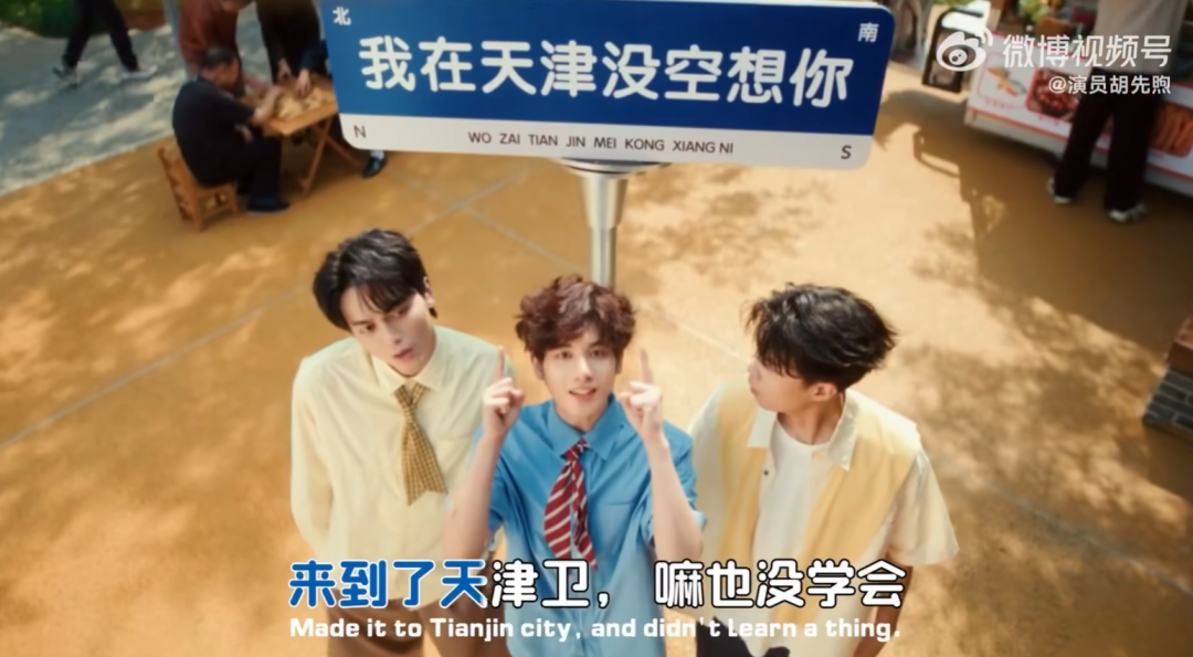 它不是等热度上来了才贴上去,早在喜人2开播前,安慕希就邀请胡先煦和小力士拍了一只很chill的短片。