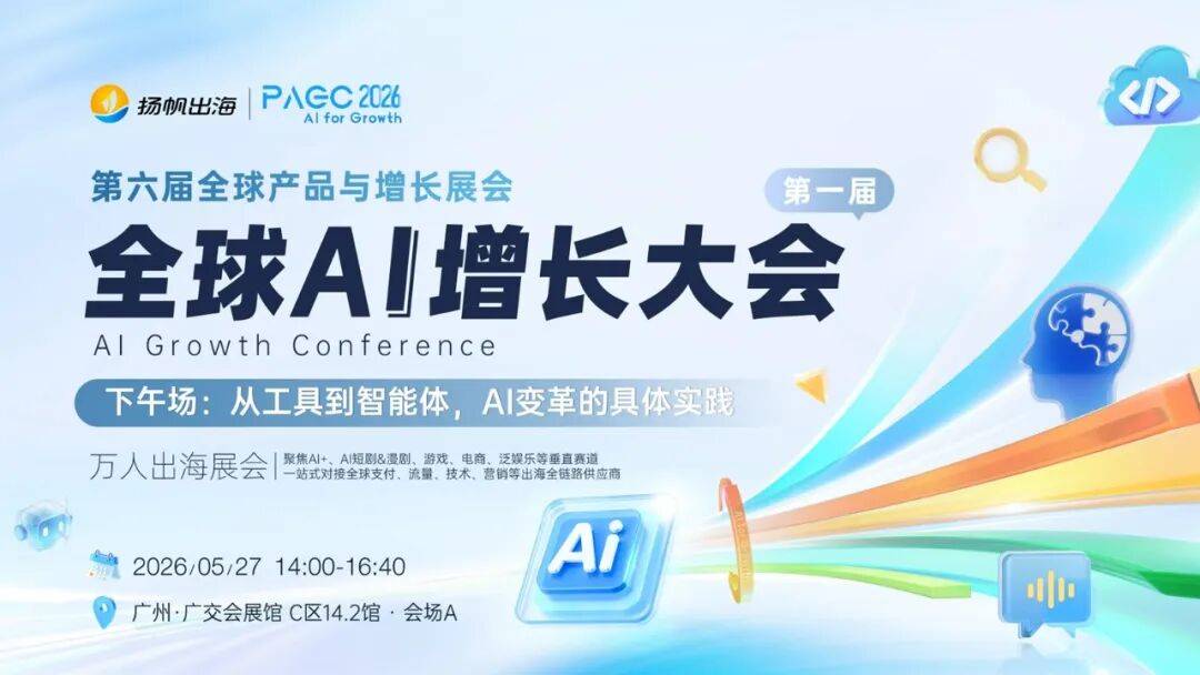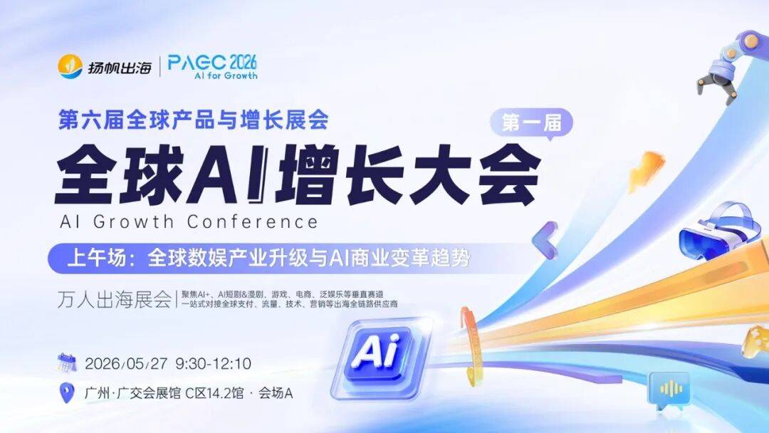 5月27-28日,第六届PAGC·暨第一届全球AI增长大会(AGC)将于中国广州·广交会展馆C区14.2-15.2馆正式启幕。为了更好地帮助出海者们链接资源,本届PAGC 2026共设1场AI全球增长峰会、3场行业对接会、8场主题论坛和1场VIP高层晚宴,覆盖全赛道热门话题,邀请100+海内外顶尖嘉宾演讲,聚焦AI+、AI短剧&漫剧、游戏、电商、泛娱乐等垂直赛道,一站式对接全球支付、AI算力、流量、技术、营销、物流等出海全链路供应商,助力出海从业者在智能变革中撬动全球确定性回报。