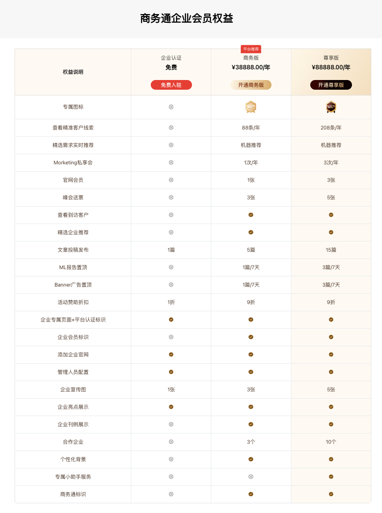 其一、企业会员。分为商务版和尊享版,前者1年可以有88次查看精准客户线索的机会,后者有208次。以及都可以享受官网文章投稿发布、参加Morketing私享会等多重权益。